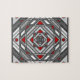 En koncentrerad kvadrat-mandala ser ut som en tunnel som ritar in tittaren med en kombination av vinklat linjer, trianglar och cirklar i skuggor av grått, rött och vitt för att nästan skapa en optisk illusion.