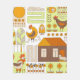 Tupp och två höns, ägg, blommor, hus, teckning på vit bakgrund. Geometric mönster, abstrakt, hand plockade, vintage