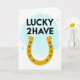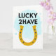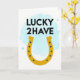 Det här kortet har en gyllene hästsko centrerad på en vit bakgrund, dess varma gula ton ger scenen en vänlig och välkomnande glöd 💚. Ovanför står orden “LUCKY 2HAVE” i svarta versaler, prydligt placerade ovanpå hästskon som en självsäker rubrik. En mjuk ceruleanblå ton flyter bakom den övre texten och hästskons övre kurva, som en lätt molntäckt himmel. Små mörkblå prickar löper längs hästskon som snygga nitmärken, vilket ger en jordnära detalj som balanserar det soliga guldet. Svagare, genomskinliga blå cirklar sprids runt den blå tonen, som bubblor som stiger och driver, vilket får utrymmet att kännas luftigt och tätt. Den enkla layouten lämnar gott om vitt utrymme, vilket får hästskon och budskapet att kännas som om de