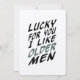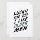 Få honom att skratta med det här konstiga och flirta födelsedagskortet! Perfekt till din pojkvän, make, fästman eller någon stilig man i ditt liv, det här stygga födelsedagskortet är ett lekfullt sätt att fira. Vare sig det gäller en födelsedag, en årsdag eller till och med en Alla hjärtans dag är detta kort ett underbart val för alla som uppskattar humor. Perfekt för BF, pappor eller vänner med en känsla av roligt, det här födelsedagskortet i humor ger en kinkig snurra vid varje särskilt tillfälle. Visa honom lite kärlek med ett kort som säger allt - Lucky för dig, jag gillar Older Manar!