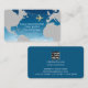 Snyggt kontaktkort för att befordra dig själv med elegans på framsidan: överdimensionerad blek grått karta i världen och ett faux guld-flygplan, namn och yrke (turistguide, reseguide agent ...) och anpassningsbar slogan (här går vi tillbaka); tillbaka: linjer av text (business namn, mobil, e-post och adress) på blå himmel bakgrunden med företagslogotyp.