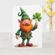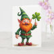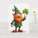 Det här kortet visar en gladlynt småtomte centrerad mot en ljus vit bakgrund, tecknad med rundade, nästan lerliknande former. Han bär en smaragdgrön tunika med en guldbrosch, randiga strumpor och klumpiga röda skor, allt krönt med en hög, lockig grön hatt som reser sig ovanför hans huvud. Hans orange skägg är fullt och strukturerat, och hans ljusblå ögon och rosiga kinder ger honom en vänlig och inbjudande uppsättning, som om han log mot någon strax intill. I en uppåthållen hand håller han en grön fyrklöver ☘️, riktad utåt som om han erbjöd den till en nära vän. Ljusinsatsen är mjuk och jämn, och formar kurvorna på hans ansikte, hatt och kläder utan hårda skuggor. En kort St. Patrick’s Day-hälsning visas nära toppen i grönt tryck, med en mindre textrad under