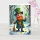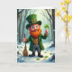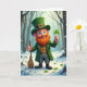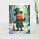 Denna gratulationskort visar en gladlynt småtomte som står i en snötäckt skog, hans ljusa gröna ögon och rosiga kinder framhävs av ett eldrött skägg. Han bär en smaragdgrön kappa och en matchande toppig hatt med svaga keltiska mönster, plus en guldbeslag som fångar det mjuka ljuset. I den ena handen håller han upp en treklöver ☘️ som om han erbjuder den till någon strax utanför scenen, och i den andra handen griper han en liten lantlig kvast som om han just har avslutat att röja en stig för en vän. Bakom honom tonar kala träd in i bleka blå- och vittoner, med en lätt dimma eller snöfall som hänger i luften. Små gröna treklöver 💚 tittar fram genom snön runt hans kraftiga svarta stövlar och ger en mjuk kontrast till den vinterliga marken. Greetingtexten sitter nära to