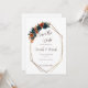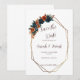 Meddela din kommande bröllop med denna Teal och Bränt Orange Spara Datum-mall, designad med en ren vit bakgrund, rika blomtoner och en modern guldgeometrisk ram. Denna 5x7 Canva-mall är perfekt för höstbröllop, modern romantisk stil eller boho-glam-färgpaletter. Snabbt att anpassa och lätt att skriva ut eller skicka digitalt!