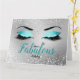 Turquise Fabulous Glitter Ögon Large Birthday Card har ett par stora öga-lock med turkos glitter-effekt, ögonblad, diamanteffektstomme med långa svarta utslag på silver glitter-effektbakgrund. Ord är "fantastiskt" skrivet i ett skript i en matchande turkos färg med en liten silver drottning krona hängande från toppen av slingan på "L". "Ha A" och "Birthday" i svart, mindre skript ovanför och under ord. Insidan av kortet är vit och på insidan finns en liten silver-drottning krona. Bakom baksidan finns samma silver glitter-effekt som framsidan och ett litet par av samma turkoseffekt glitter ögon och svarta utslag i centrum av grund. Designad av Jacqueline.