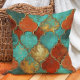 Förbättra din décor med den marockanska quatrefolialen dekorativ kudde med en slående blandning av turkos, bränd orange, rost och guldkrut. Det plågade avslutar ge en vintage, det västerländska utseendet medan det feta geometriska mönster tillför global-inspirerad charm. Perfekt för vardagsrum, sovrum eller utomhussittplatser. Den här dekorativa kudden ger värme, struktur och färg till vår och sommarrum.