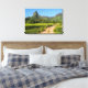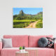I Canvas landskap skrivs en kvinnlig turistcykel ut på en smal väg med Rotuiberget i bakgrunden på den tropiska ön Morea, nära Tahiti, i Fransken Polynesien.