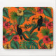 Tropiskt sömlöst mönster med tropiska löv och blommor och 2 tukanfåglar.