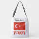 Turkiska flagga visar på denna korsningspåse med ord TURKIET nedanför i färg som matchar flagga. Flagga är röd, med ett vitt halvmånsfärande måne och en vit stjärna. Det finns utrymme för att lägga till ditt namn för en anpassad tryckning eller lägga till någon annans namn för en personlig-gåva.