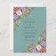 Denna design har en stämningsfull turkos bakgrund prydd med rika akvarellbotaniska element. Klasar av rosttonade rosor, lila syrenar och krämfärgade blommor skapar en stämningsfull och romantisk känsla. Mjuka eukalyptusblad och jordnära löv fullbordar utseendet, vilket gör det idealiskt för ett sofistikerat säsongsbetonat evenemang.