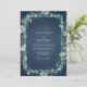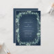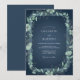 Denna design har en djup turkos bakgrund prydd med en delikat, bladrik botanisk krans. Subtil ljusgrön lövverk och bleka blågröna blommor skapar en elegant, naturalistisk kant som frammanar en lugn och romantisk atmosfär för din speciella dag. Konsten har en subtil, nästan akvarell-liknande kvalitet.