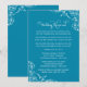 Ge en ljus och glad energi till er repetitionsafton med denna cerulean turkosa bröllopsinbjudan till middag. Vita scrollverk prydnader pryder hörnen medan flödande kalligrafi rubriker en söt rimmande dikt med alla detaljer för ceremonipraktik och middag. Den livliga blåa bakgrunden gör ett djärvt och inbjudande intryck. Varje element är fullt redigerbart för att perfekt matcha er fest.