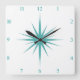 Den moderna fyrkantiga klockan i mitten av århundradet har en djärv turkotisk blå atomisk starst och matchande nummer, som kommer att göra ett fantastiskt tillägg till väggarna i ditt hem eller på ditt kontor!