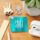 En enkel tredimensionell monogramdesign i brev på en rundad fyrkantig tvåsidig nyckelkedja. På framsidan är den vita textdesignen anpassningsbar för dina 3-brev monogrambehov. Du kan ändra teckensnittet färg. Bakgrunden på båda sidor har en faux turkos och aqua blue ombre metallic foil digital art grafik. Om du vill.. lägg till ett eget foto eller text på baksidan för att skapa din egen nyckelkedja för personlig. Den digitala bildeffekten skrivs ut som ett foto med en monografisk textdesign.
