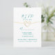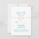 Modern, minimalist, elegant teal bröllops-RSVP-kort med gul repsnöre hjärta och enkel kalligrafi handskriven stil.