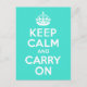 Turkos och vit "Keep Calm and Carry On", modern version av klassisk poster. En klassisk design med ett smart modernt färg. Typografi på vykort.