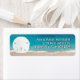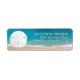 Tropiska vatten returadressetiketter. Mörkt turkost havsvatten sköljer mot stranden med en stor, vit sanddollarbild. Vit tryckt text för namn och adress på smala etiketter.