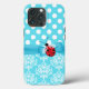 Charming turkos och vit iphone case, med turkos och vit dammmönsterbakgrund, på grund och en turkos och vit polka punkt mönster, på överkanten. Bilder av ett band, springa över mitten och dekoreras med en söt röd och svart ladybug. Anpassa för att lägga till text.