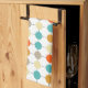 Den här färglösa moderna kökshandduken i mitten av århundradet har turkosblått, två nyanser av orange, kräm och stearincirklar på ett svart fogat rutnät. Lägg till den roligten till din köksdekoration!