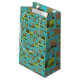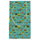 Denna presentsäck har en modernt design i mitten av århundradet av rundade rektanglar i gröntens nyans och brunt med hål i dem på en fält av turkos. Om du tycker om designen men föredrar olika färg, säg mig.