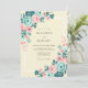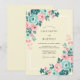 Denna design har en frodig arrangemang av akvarellrosor och ranunkler i nyanser av mjukt rosa och djup turkos. Mot en krämfärgad bakgrund skapar de måleriska blomklustren en romantisk och tidlös atmosfär perfekt för en vårhögtid. Djup smaragd och turkos lövverk ger en touch av kontrast till de känsliga pastellblommorna.