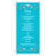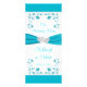 Detta romantiska, vita och turkosa blåa bröllop-menykort för blommigt har en bild av ett par gått med hjärtan som är ovanpå en turkos- eller tealblått band som löper tvärs över kortets bredd. Det finns turkoser och viner ovanför och under ribban på en vit bakgrund som har namn av bruden och brudgummen, och bröllop-datumet i blått nedanför ribban, med "Vår Bröllop-meny" i blått ovanför ribban. Baksidan är turkos med silver som ser blommor som är riktade över menydetaljer i vitt. Om du behöver ytterligare matchande artiklar skickar du en e-postbegäran till niteowlstudio@gmail.com eller användor Zazzle-chattan för att få kontakt.