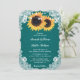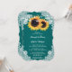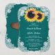 Denna eleganta rustika landsbyhustru turkos bröllopsinbjudan med två solrosor mot en turkos filt bakgrund prydd med vit blommig spets och strängljus är perfekt för att inbjuda dina gäster till din turkosa rustika land, bakgård, trädgård eller lada bröllopsfest inspirerad av solrosor.