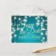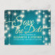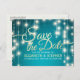 Bröllop Spara Datumet Postkortmallar - Elegant Falskt Guld Folie Spara Datumet Bokstäver Skript och Vintage Strängljus med Turkos Blå Glitter Gnistrande Bakgrund.