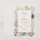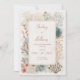 Dyk in i det oväntade med denna vackra turkos terrakotta-guld unika botaniska ram-inbjudan, en fängslande blandning av rustik och raffinerad. Denna detaljerade design har en utsmyckad kant av handmålade organiska element, som liknar allt från koraller och djuphavsväxter till ömtåliga torkade blomsterkvistar och texturerad lövverk. Det rika färgschemat förenar varm terrakotta och taupe med oväntade inslag av djup turkos och dammig blå, vilket gör det till det perfekta valet för en höstlig kust- eller vinterbohemsk fest. En subtil glänsande guld-folie linjerad ram innesluter elegant dina evenemangsuppgifter och förankrar den organiska kaos i sofistikering. Detta är den ideala brevpapper för ett unikt, konstnärligt eller naturinspirerat bröllop som söker en hög mode, texturerad look. Du kan använda denna slående inbjudan för att dela din ceremoniinformation, för att inkludera ett informationskort om resor, för att detaljera din mottagnings schema eller för att presentera din br