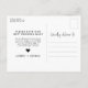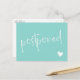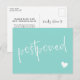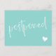 Berätta för dina gäster att bröllopet har skjutits upp och ge dem ett nytt datum eller länken till din hemsida för mer information med detta turkosa och vita vykort med en minimalistisk typografisk design där "postponed" skrivs över "change the date" vykortet i ett charmigt handskrivet typsnitt tillsammans med ett vitt hjärta. På andra sidan kan du skriva den nya informationen och under ett litet hjärta era namn i en ren modern typsnitt.