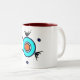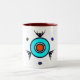 "En slank keramikkopp med en modern turkos och orange geometrisk ögon-design. Denna konstnärliga pjäs tillför en djärv, modern touch till ditt skrivbord eller morgonkafferutin."