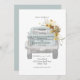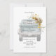 Bröllopsinbjudan. Cowboy Boots och hatt. Sträng av Ljus. Solblommor. Bakgrund för lätt turkos. Vintage Lastbil.