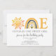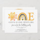 Boho-regnbågen första födelsedagsfest inbjudan med en guld och svart regnbåge med honungsbin och sol med röntgen. En söt text. Lägg till ditt barns namn.