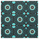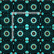 Sömlös dekorativ geometrisk mönster med stiliserade geometriska blommor i turkos och gult på svart bakgrund.