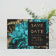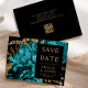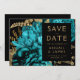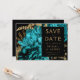 Den här eleganten har det moody bröllop spara datum-kortet en lush, romantisk blommigt buquet i turkos med guld faux foil och glitter foliage mot svart bakgrund. Anpassa guld-färgad-texten i snyggt typsnitt på en svart rektangel och lägg till ytterligare en kort text på baksidan, tillsammans med en QR-kod som hjälper dina gäster att besöka webbplatsen för bröllop.