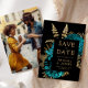 Den här eleganten har det moody bröllop spara datum-kortet en lush, romantisk blommigt buquet i turkos med guld faux foil och glitter foliage mot svart bakgrund. Anpassa guld-färgad-texten i snyggt typsnitt på en svart rektangel och lägg till lodräts favoritbild på baksidan.