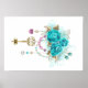 Antique guld nyckel med trendig turkos ro dekorerat med löv av vitt guld och rosa och blått pärlor. Fashionable färg. Turquise ro. Vitguld. Blå tiffany.