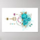 Antique guld nyckel med trendig turkos ro dekorerat med löv av vitt guld och rosa och blått pärlor. Fashionable färg. Turquise ro. Vitguld. Blå tiffany.