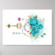 Antique guld nyckel med trendig turkos ro dekorerat med löv av vitt guld och rosa och blått pärlor. Fashionable färg. Turquise ro. Vitguld. Blå tiffany.