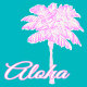Rosa och vitt handflatan träd och aloha text med turkospresentation. En roligt-summerande tropisk titt på din bakgård i somras.