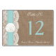 Trädgårdsuppsamlingen med turkos och dollarns bröllop är en fantastisk utformning med en underbar rustik-kolveffektbakgrund med en romantisk vintage vit snöre-effektstam avslutat med ett bedövande sand-dollar och turkosribbon. Dessa kort för bordsnummer kan vara personlig för ditt särskilda tillfälle och skulle göra perfekten bord till en central punkt för bröllop, möhippa, förlovningsfest, födelsedagsfest och mycket, mycket mer. *Observera att Zazzle endast säljer tryckta produkter så att den här artikeln inte har något riktigt material som täcker snöre, sand-dollar eller band. *** HUR DU ORDER *** Anpassa och lägg till varje bordsnummer-kort i kundvagnen, en i taget. Zazzle har för närvarande inget system för att tillåta någon anpassning av produkterna efter det att en beställning har gjorts.