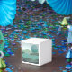 Detta fantastiska landskap ligger i vackert texturerat lagrar och skuggor av turkos och akvarier med sol och backe och berg.