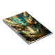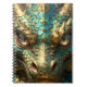 A notebook with a cool close up illustration of a turquoise and metallic gold dragon face with realistic eyes. Fantasy art realism dragon art.