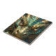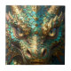 A tile with a cool close up illustration of a turquoise and metallic gold dragon face with realistic eyes. Fantasy art realism dragon art.