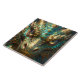 A tile with a cool close up illustration of a turquoise and metallic gold dragon face with realistic eyes. Fantasy art realism dragon art.