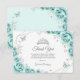 Turquoise silver and white floral Quinceanera thank you card. Features, script font, silver butterflies, watercolor roses and tiara. Perfect for an elegant princess style glam celebration. Personalize with your own details.