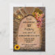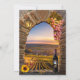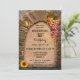En underbar romantisk födelsedagsfest inbjudan med en romersk båge med druvor, en lantern och vin flaska och solrosglasögon, som förbiser en vinodlad landskapsplats vid solnedgången. Vackert för vin älskare, vinodling eller vinodling firande.