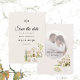 The refined layout highlights the wedding date while creating a romantic European atmosphere perfect for destination weddings in Tuscany, Italy. The reverse side includes a soft engagement photo framed in a circular layout with a romantic message celebrating your upcoming wedding in Tuscany.