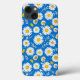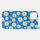 En livfull och glad mönster av tusenskönor mot en klarblå bakgrund. Tusenskönorna är främst vita, med djärva gula centra, och de är arrangerade på ett spritt men balanserat sätt. Förutom blommorna finns det olika gröna blad och ömtåliga stjälkar utspridda genom hela designen, vilket ger en touch av natur och friskhet. Den övergripande kompositionen skapar en livlig, sommarlik känsla, vilket gör den visuellt tilltalande och inbjudande.