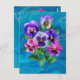 Färgrik akvarellbukett av violer penséblommor på en blå akvarellbakgrund och inskriptionen TACK på baksidan.